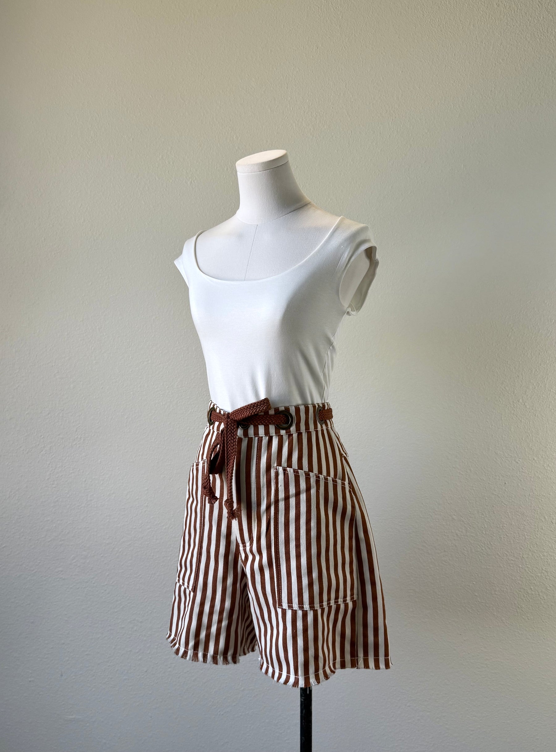 Featuring bold stripes, a high rise fit and raw edges. Crafted from durable denim with a rope drawstring for added charm.